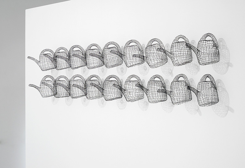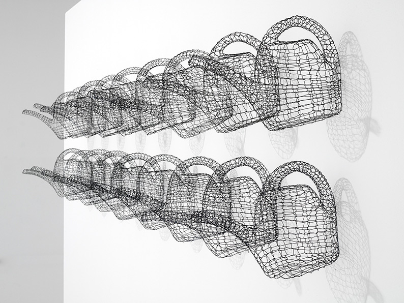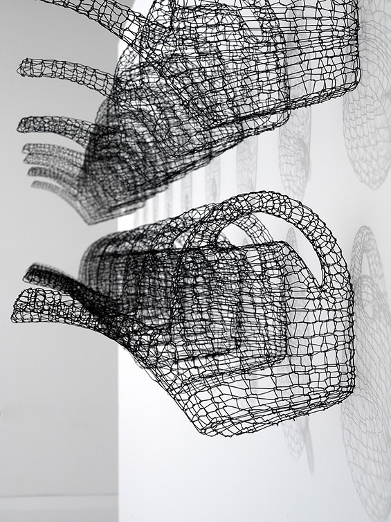 Gleichmass und Wiederholung von alltäglichen Handlungen finden ihren künstlerischen Widerhall in der seriellen Anlage vieler Arbeiten von Barbara Geyer. So erhalten beispielsweise Gegenstände des täglichen Gebrauchs eine massgeschneiderte Gewandung aus engmaschig geknüpftem Draht. Der Begriff „made to measure“ – im gedanklichen Gegensatz zum Ready-made – ist der Künstlerin wichtig, wenn sie ihre Drahtplastiken auf der Basis eines alltäglichen Massenprodukts in grosser Zahl seriell produziert.